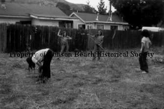 A black and white original print of 4 teen-agers clearing the field for basketball court 1970's. It is now the Village Green I. The girl in center holding the rake is Stacy Schauf. The left of her is Hillary Raymond. The 2 houses and a small trailer sit behind the fence.