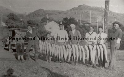 This original black and white photograph shows 8 fishermen (2 are boys) holding up their 23 catches (salmon) in front of their car parked near the corner of Marine Way and Arenal Ave. when fishing was still abundant. There are 4 houses/structures in the background. Also shown are the dividing posts of Rancho Bolinas and Rancho Sausalito parcels.