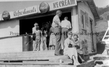 This black and white photograph shows the corner and service window of a food stand. It is Seadowns restaurant (see #1998-147-01). There are two children and two women standing a the window with their backs to the camera. There are two women seated on the right hand end of the steps. They are, left to right, Rose Parsons and Louie George. Behind them are two men, turning toward the window. They are, left to right, Frank George and Jack Parsons (see notes).