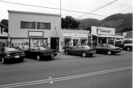 This black and white photograph is of three store fronts lining Highway 1 in downtown Stinson Beach. The front on the left has large glass windows with what appear to be posters on them. It has a sign above the windows which is illegible in this photo. It is the old Stinson Beach Library. Next to it on the right is a lower, smaller building with a window on each side of a door, taking up the entire building front. There is a large sign above the windows and door saying Oceanic Realty. To the right of this building is another small building with an overhang jutting out, creating a covered front porch across the width of the building. There is a sign above the overhang, illegible in this picture. It is the Sand Dollar Restaurant. There are cars in front of these buildings parked at right angles to the highway.