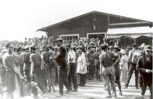 In this black and white photo we see a crowd of people in front of a dark building with an awning. In the left foreground there is a man with a dog on the leash. The event is the end of the Dipsea Race. The building is the Bungalow (which became the Stinson Beach Grill in 1994)