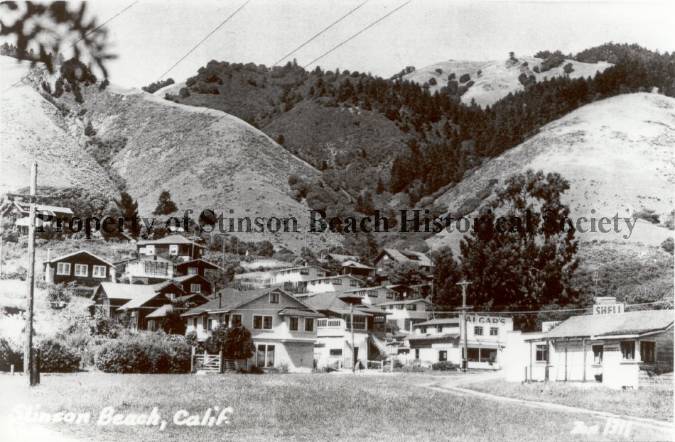 B&W photograph copied from a postcard of the downtown and hill area of Stinson Beach. On the far right is a white building with a Shell sign on the roof. To the left of that is a white 2-story building with Al's Cars painted on the side. Further to the left are two 2-story wooden houses and homes continue up the hillside, which takes up the top half of the photo.
