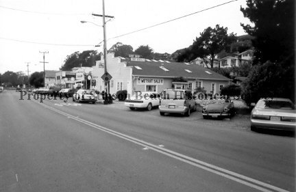 This black and white photo is taken looking down a road (highway 1). Across the road is a row of four cars parked diagonally to the edge of the road and beyond them is a large barn-like building which houses the Surf Shop. The entire side of the building is visible. There are two signs, one above the other, along the roof spine. The upper one says SURF SHOP and the lower one says SURF RENTALS . Below the roof, on the side of the building, is a sign saying WET SUIT SALE. Farther down the road, beyond the Surf Shop are other buildings with cars parked in front of them. There are trees on the right of the picture and behind the Surf shop as well as some hillside cottages. There is a telephone pole in front of the Surf Shop and two more farther down the road.