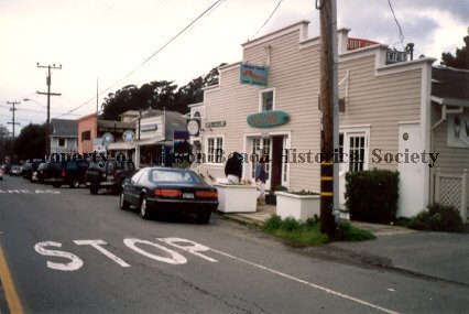 An original color photograph of Stinson Downtown in 1996 showing from the right, Avilla's Barn housing three businesses (see 2005-100-01), Sand Dollar Restaurant owned by Kendrick Rand, Stinson Beach Library, Al's Alleged Antique Shop owned by Al Engel (only the second story yellow dormer visible), and the Shore Store owned by Mame Grace (her partner Julie Spencer was deceased by then). Several cars are parked in front of the businesses. "Stop" written on the highway indicating approaching stop sign is seen on the road in front of them.