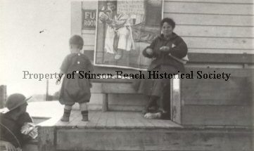 This black and white photograph depicts the side of a building with a bench running along it. At the right of the picture is a large box in front of the bench and a woman in a dark dress is seated on the bench, partially behind the box. She has a purse tucked under her left arm. Hanging against the building behind and beside the woman is a poster with a picture of a knight holding a sword with a casket beside him. The top of the poster is cut off but the bottom words read 'Bolinas Clubhouse Tonight Show Two Comedies'. Behind the poster, partially obscurred by the poster is a sign on the wall. The letters showing are FU and under that ROO and part of an M. Standing in front of the corner of the building with his back to the camera is a little boy in a one piece, knee length bloomer suit and mid calf length socks. The bench and the boy and the woman are on a raised platform. At the far left of the picture the upper body of a woman wearing a hat can be seen. She is sitting on the steps going up to the platform looking at the woman seated on the bench.