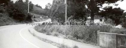 Wide angle view of Highway 1 going south as it leaves town. It follows a bend to the right beginning at the concrete bridge on the lower right side. Beyond the top floor of the motel(?) is visible through the branches of a large tree and the overgrown foliage along the road. There is a raised concrete sidewalk along the road. Across the highway is the hillside with some darker trees and roadsigns.