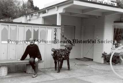 B&W photo of Claudia Chapline sitting on a concrete bench outside her Gallery at 3445 Shoreline Highway. She is dressed in a black sweater and gray pants with mocassin-like shoes. Next to her stands a metal art sculpture of a cow facing the doorway. The bench is in front of a wooden fence showing the address and various geometric shapes are assembled in a row along the upper part of the fence. In the window on the right various art objects are partially visible. Beside the window, in the alcove of the main entrance to the gallery, there is a painting with a 2-color lightning strike on it.