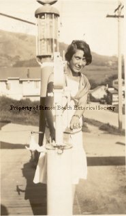 An original photograph of Mildred Sadler standing by the gasoline tank at the Airey Store-Hotel. You can see downtown Stinson to the south. On the back May 8 1930, Bear Photo Service stamped. Mildred Sadler was a long time teacher at the Stinson School and later a tireless community center advocate.