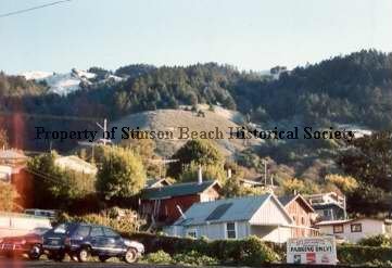 View of the hillside, with buildings down below, from Calle del Mar in front of Ed's Superette. It is a sunny day but snow on the distant hilltops is visible above the treeline. In the lower left corner is a sign indicating Parking Only for Ed's Superette. Two cars are parked uphill. The side and rooftop of a white building sits behind the hedge at the edge of the parking area. Two red buildings sit behind it and another white building with red trim is beyond them.