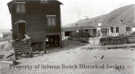 Two-story wooden house on the beach at end of Calle del Pinos (#24) circa 1939. There are wooden stairs on the left going up to a door. A person is sitting on the top of the stairs. To the right of the house is another one-story white house (#20) with a flat wood fence surrounding it.