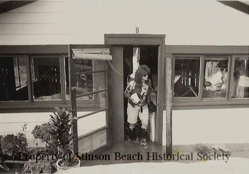 Gayle Boyce in black galoshes exits through the water in the doorway of her cottage on Calle del Resaca.