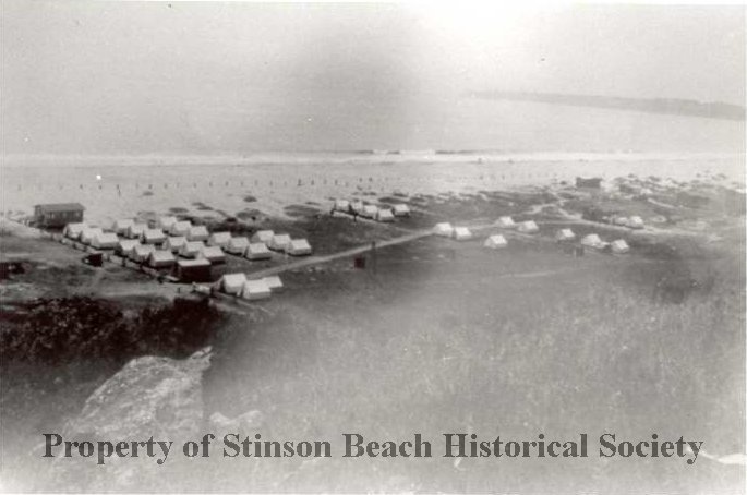 This is a photo of a tent encampment on Stinson Beach, taken from above. The foreground shows a large rock and some vegetation. At midground, 8 unpaved roads divide the campground with tents set up in straight rows plus several small structures. There is a log cabin on the far left, on Calle del Resaca, which belonged to Charles Lauff. The background shows the ocean and a row of pilings. This may be an original photo.