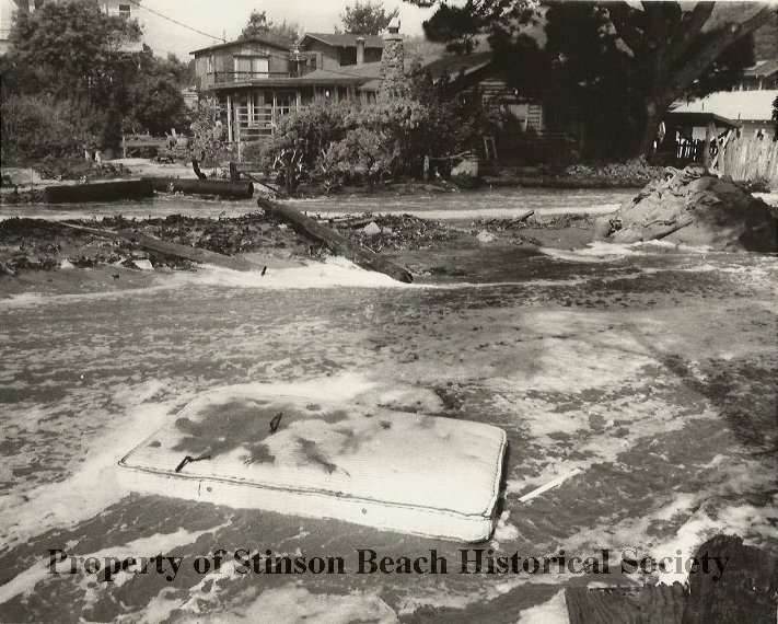 On Calle del Ribera a mattress washes down the road with the ocean water. The road is strewn with large debris, several large logs and telephone poles, and piles of indecipherable stuff. The 2-story home across the way looks relatively unscathed but its yard is flooded.