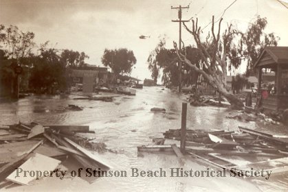 A black and white photograph of the Stinson Beach flood of 1983, in which floods from the ocean swells bring debris from the Boyle house through the Calles to Hwy. 1. The picture is taken from Calle de Resaca. Wood debris and water are in the foreground. Surviving houses are shown and at the center a helicopter in flight. A power pole is still standing, but a large tree to its right leans toward the street.