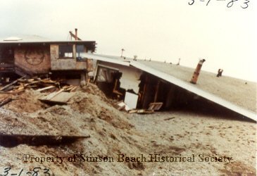 Rooftop slanted into the sand is all that is left of Syd Boyle's house. Mounds of sand and wooden debris obscure any damage to the shingled house left standing behind it.
