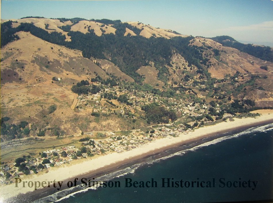 Aerial photograph of Stinson Beach development and the hills above. Includes houses on Panoramic Highway to right and houses on Rafael Patio at lower left. Shows surf line in front. On the back of photo a sticker printed: Air Photo, Inc. Copyrights Resv. 1997 (425) 774-5360 27BOLNI - 100 Bolinas, Ca