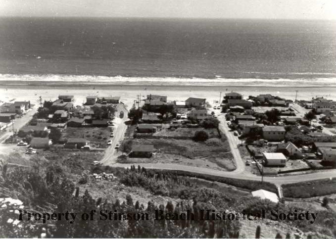 This black and white photographic print is an overview (L to R) of Calles Onda, Resaca, Ribera and Embarcardero in the 1970s.The ocean is in the background, Calle del Arroyo in the foreground.There are houses along Onda, Resaca, and Ribera.