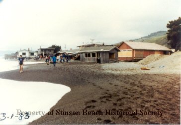 View of the Upton Beach portion of Stinson Beach, looking south at the houses that bore the brunt of the 1983 storm. The first wooden structure sits at an angle on the sand, its windows empty. The red one-story house behind it has its windows boarded up. Beyond is a group of people, perhaps checking out the wreckage of Syd Boyle's house. Further on the houses seem to be in decent shape. Some white surf is visible on the left of the photo.