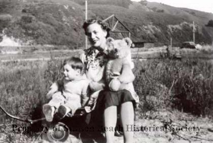 Black and white photograph of Marian Upton sitting with her son, Charles, in the dune grasses of Stinson Beach. She is holding a large teddy bear on her lap. He son is sitting by her side looking away from her and Teddy. He's wearing a light colored jumper; she wears a dark shirt and light sweater. Behind them is the Robinson house under construction. Only the frame is visible. The hillside slopes up in the background.