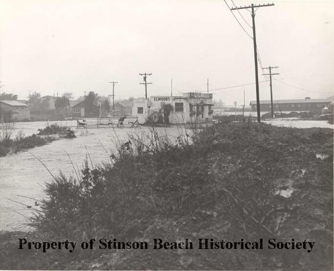 This black and white photograph of flood waters from the 1956 storm shows damage in the Calles and to buildings. One person is at fence near Elwood's. Debris is piled in foreground.