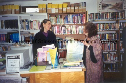 Inside the old library, Kerry stands behind her desk looking at Susan Tacherra. Susan is standing beside the desk holding a map and looking at Kerry. The shelves behind them are filled with books. On Kerry's desk is a computer monitor, numerous informational materials (plus a Wanted sign for books) and a small pile of books on the corner. There is also a nature print on the wall over one bookshelf.