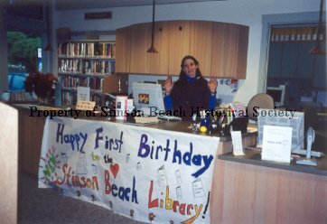 In this color photograph a woman (Kerry Livingston, librarian) stands behind a counter covered with library paraphernalia (pencils, pens, stamps, brochures, a computer). She has both hands raised to shoulder level with palms facing outward and is smiling at the camera. There is a large hand painted sign attached to the front of the counter reading 'Happy First Birthday to the Stinson Beach Library'.