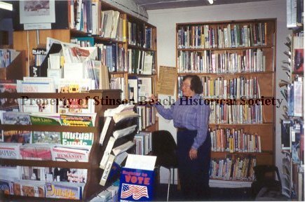 Shirley Moyce stands in an alcove of book shelves in the old Stinson Library. She has her hand on a book on the middle shelf. She is wearing a purple blouse and black trousers. At the end of the shelves on the left is a full magazine rack.