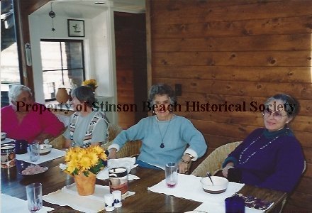 Seated along the lunch table are (L to R) Nancy Sullivan and Phyllis Fitzpatrick in deep conversation, and Sally Veauta and Hillary Lorraine smiling graciously at the camera. There is a knotty pine wall behind them while a window and white counter with assorted objects on it, plus a black & white wall clock, is visible behind Nancy & Phyllis. The table has a few leftover dishes and glassware (plus the yellow plant) on it.