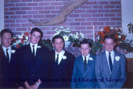 Color photo of 5 young boys in suits (the three on the left are wearing black, the two on the right are in blue check) with white buttonieres on their lapels standing in front of the fireplace (in the SB Community Center). Greg Sherfey (the only boy identified) is the second from the left. The fireplace mantle has bouquets of red and white flowers.