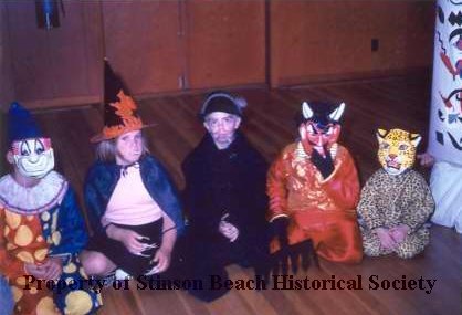 This color photograph is of five children sitting on the floor in a row, in costume. They are, from left to right, a clown, a witch, a pirate, a devil and a leopard.