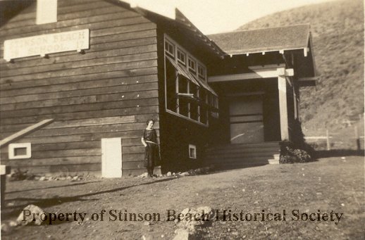 Stinson Beach schoolhouse in 1921 was a wooden barn-looking structure with slanted roof and windows on south-facing side. The windows, which lift outward, are open. Beyond them there are a few steps up to a small porch with a door into the school house. There is also a small white door at the west-facing right corner of the building and similar opening at the very center top, beneath which is a Stinson Beach School sign. The ground surrounding the building is bare except for a few large rocks, perhaps demarking a pathway to the steps. A hill rises up beyond it. At the corner of the building a woman is standing with her hands in the pockets of her dark below-the-knee dress. She is identified on the back of the photo as Louise Avera. The date is Nov. 23, 1921.