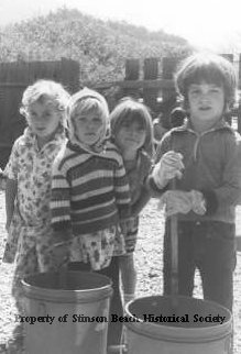 This black and white photo is of four children standing behind two plastic buckets. The boy on the right is wearing gloves and is holding a stir-stick which is in the tub in front of him. Three girls are clustered behind the tub on the left. The girl on the far left is unidentified. The other children from left to right are Erica Willig, Amalia Ahlgren and Dan Harrington.