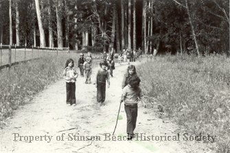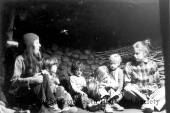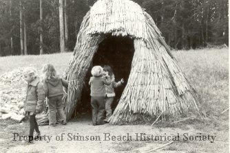 Six black and white photographs depicting a Preschool field trip to the Native American Village, Kuleloklo, in Bear Valley. The children are shown hiking in to the village and sitting or standing in and around teepees constructed of reeds.