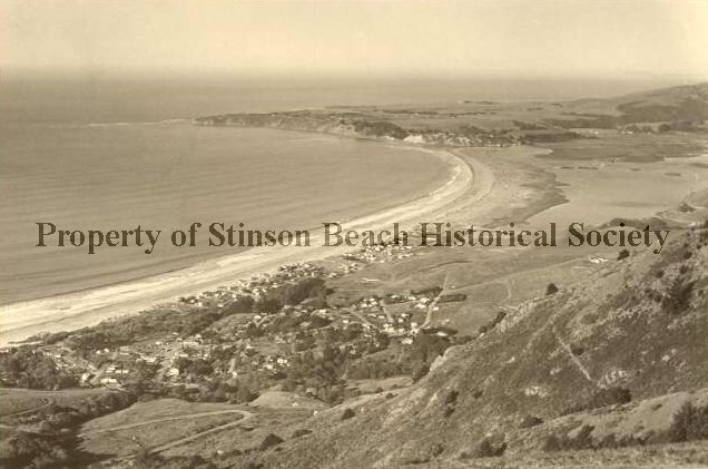 The photograph shows all the neighborhoods of Stinson Beach: downtown, the calles, the patios and the highlands. At the time there was no Seadrift development.
