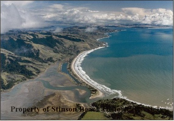 Aerial photograph postcard of Stinson Beach and Bolinas Lagoon from the tip of Bolinas Mesa to San Francisco. The hills behind the Beach and Marin Headland are also shown. White thunder clouds float on top of all. It reads on the back; Stinson Beach /Bolinas Lagoon Photo by Robert Campbell Greater Bay Aerials P.O.Box 714, Sonoma, Ca 95476-0714. On The Edge of both North American and Pacific plates. Bolinas Lagoon sits atop the San Andreas Fault, illustrating the geologic principle of plate tectonics. Taken at low tide, this dramatic view looks out over Bolinas and Stinson Beach to Marin Headlands, the Golden Gate and San Francisco.