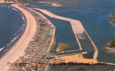 Color aerial photograph of Seadrift development made into postcards. There are 2 of the same postcards. The caption on the back of each postcard reads, "Sea-Drift, located in Marin County, just forty minutes from downtown San Francisco, on the natural sand-split between Stinson Beach and Bolinas. Sea-Drift Lagoon is land-locked. The water level is controlled and protected for sailing and swimming. The Pt. Reyes National Sea Shore lies (just) a few miles to the Northwest. Color photo by Aero Photographers, Inc." It is printed by Natural Color by Mike Roberts, Berkley 2, Calif.