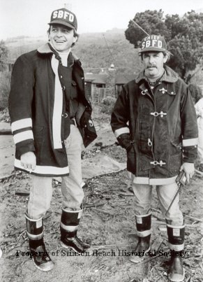 Volunteer fireman Jim Fischer (L) and Fire Chief Kendrick Rand (R) pose for the photographer in a muddied lot - a small house is in the background. They are wearing galoshes, all-weather firemen's jackets and duck-billed caps with the letters SBFD on them (Kendrick's also has the word CHIEF imprinted on it and he is holding a walkie talkie in his hand at his side). Jim looks off to the side, smiling. Kendrick looks straight at the camera.