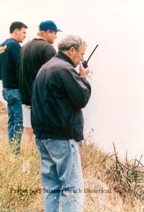 Kendrick Rand (R) in blue windbreaker talks into a walkie talkie while standing in the dry weeds at the edge of the cliff along Highway 1. Beyond him, looking out over the edge, are Steve Hills (center) and Ken Stevens (L).