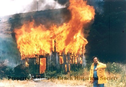 A colored photo print of raging fire of a house which was located in the field where the controlled burn took place. Fire Chief Kendrick Rand stands motioning to people not shown. He is wearing yellow firemen jacket and blue jeans shirt and pants.
