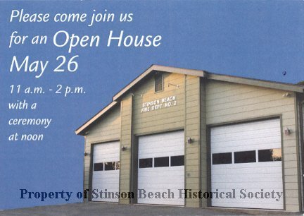 A postcard sent to every household and Post Office boxholder in Stinson Beach from the Fire Department announcing the open house on May 26, 2007 of the remodeled and enlarged Firehouse #2. The remodeling job was done by the volunteer firemen, Kenny Stevens, the fire chief.