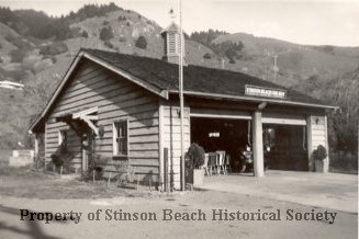 B&W photo of Stinson Beach Firehouse ca. 1950. Doors are open. One fire engine slightly visible through door on right. Folding chairs facing inward are visible through door on left. Hillside visible in the background