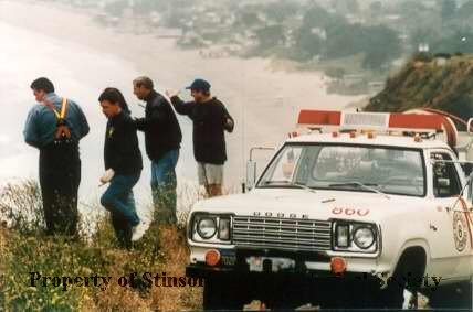 A color photographic print of 4 fire men and the fire truck at the cliff rescue in 1980s. Four firemen: Bobby Stevens, Kenny Stevens, Kendrick Rand and an unknown (probably Steve Hills) stand at the edge of cliff looking down motioning to the rescuers below. The Stinson Beach coastline is in the background. Their white fire truck is parked on the right.