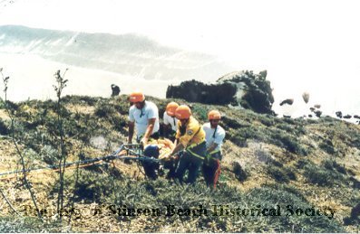 A color Photographic print of SBFD Cliff Rescue Drill. Four men wearing red hardhats carry up an injury victim (a dummy) in rescue rope litter through the brushy hillside along the Highway One. Stinson Beach can be seen in the background.