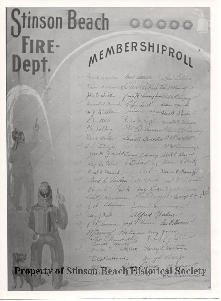 A black and white photographic copy of original document with illustrations showing signatures of the Stinson Beach Fire Dept. memberships plus illustration of two firemen and a dog at work. It includes 70 signatures including William R. Airey who was the Fire Chief. Title above reads Stinson Beach Fire Dept. Membership Roll. The original was believed to be hung inside of the fire house. 1993-248 is a similar object but different year. On the back L.Airey is written in pencil indicating it belonged to Louise Airey, wife of William R. Airey.
