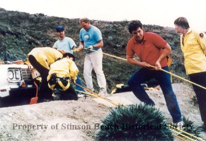 A color photographic print of 6 firemen pulling on a rope on the shoulder of Highway One. The front head lights of the fire truck are shown on the left of the firemen and the hill across the highway is in the background. The firemen facing are: Josh McHugh, Dave Horning, Bob Stevens, and Pat Norton.