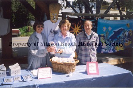 Standing behind the Historical Society table at the May 9, 1997 Cuisine on the Green are (L to R) Jane Slack in lavender jacket, white t-shirt and shades; Erma Parksons in light blue windbreaker; and Don Slack in plaid shirt with his arms behind his back. Jane and Erma are holding between them a small bag of popcorn with an American flag on it. On the table are more bags of popcorn in a wicker basket and copies of a book for sale.