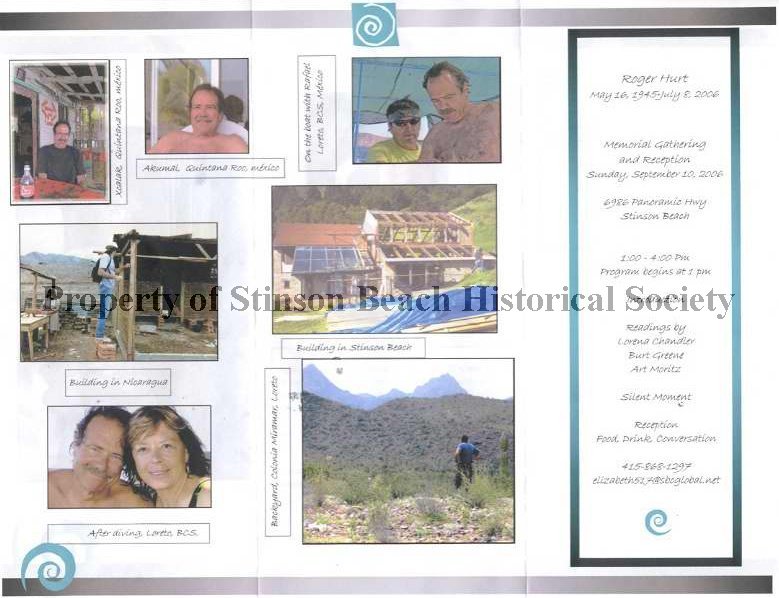A tri-folded 81/2x11 color printed mailer announcing the memorial gathering, September 10, 2006, for Roger Hurt who died in Mexico while scuba diving. Roger Hurt was (and at the time of his untimely death) a long time chairperson of the Stinson Beach Village Association. The announcement shows 7 in front and 2 photographs of him working and traveling in Nicaragua, Mexico, and in Stinson Beach. The back photograph shows him holding the new born grandson,Chance, and the text asks for recollections and thoughts of Roger from the receivers of this announcement to be made into a book for Chance. See 2009-100-02, 03.