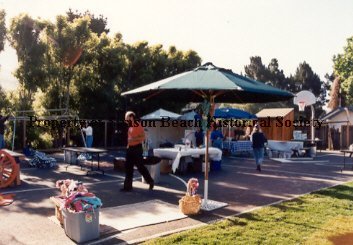 This color photograph shows tables and booths being set up on the cement pad of the basketball court. At the far right a wooden shed and the basket can be seen. To the left are tables and umbrellas. Closest to the camera is a small rug with baskets and a bin containing items for display and a blue umbrella in a stand beside it. A man in a red shirt is walking past the rug. The edge of the cement pad is at the right hand lower corner of the picture where it abuts a lawn.