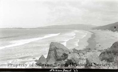 View of Stinson Beach with the tide rolling in. Looking north from an rocky outcrop, which frames the panoramic view of the stretch of beach and Bolinas Mesa.