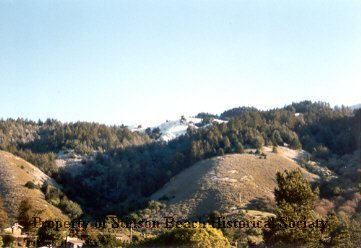 This is a color photo taken from downtown Stinson Beach and looking up to the mountain. In the center at the very top there is a blanket of snow, but all around it and down the hills there are only small patches of snow. (see image #1994-102-02).